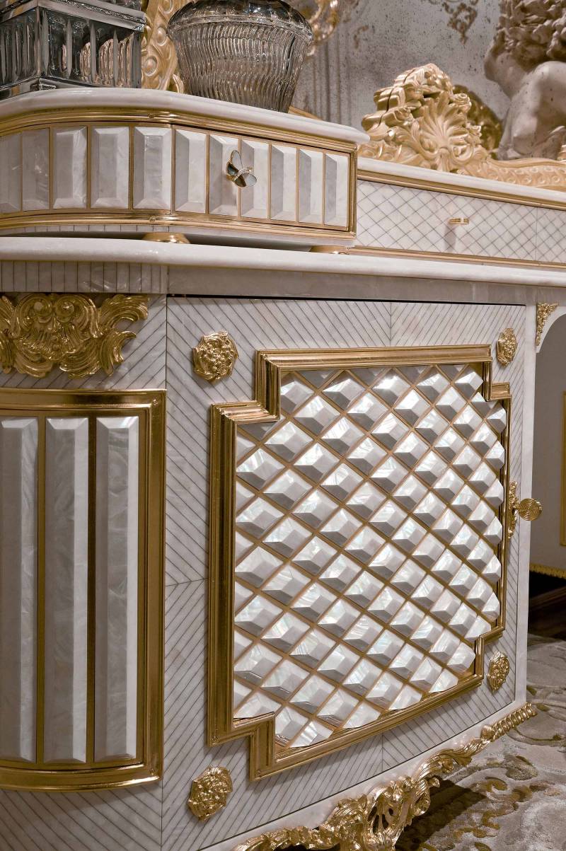 La toilette Aurea è un capolavoro che racchiude tutta la nobiltà della materia e la raffinatezza dell’alto artigianato italiano. Interamente rivestita in madreperla naturale intarsiata, la sua superficie vibra alla luce, creando giochi tridimensionali grazie ai rombi sfaccettati che la compongono. Un’opera unica, pensata per ambienti di eccezionale prestigio.